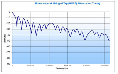 The Single-Line Performance Test in ID-337 requires a test instrument that replicates the Home Network Bridged Tap Test Loop Topology found in the standard. This topology consists of an isolated drop wire from the street to the house, known as the Network Termination Point (NTP). It also depicts in-home wiring of twisted pair cabling to 5 rooms, with the CPE connected in the room 20m away from the NTP. The other rooms are 2m, 2.5m, 5m, and 10m away from the NTP creating 4 bridged taps that are not electrically terminated and result in signal reflections of the Gfast signal traveling on each path. This produces attenuation distortion or “nulls” in the attenuation curve, based on the length of wire in each of the bridged taps. This “star” configuration affects the frequency bands used by Gfast (see diagram on next page). The HNBT-Starbox is a cable-based solution that uses CAD55 cable and provides the required test loop topology in one compact unit.