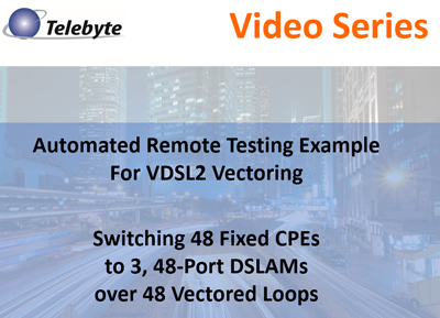 Remote Automated DSL Testing: Video Title: Telebyte Video Series Remote Automated DSL Testing 16-16x2 Length: 8m:28s Learn how to use Telebyte's switching products to configure remote automated testing using twisted pair cable. Provides an example of switching 16 DPU (or DSLAM) ports and 2 groups of 16 DPE's into 16 twisted pair lines. The lines lengths can be changed via remote commands. Ideal for rate vs. reach testing. Telebyte Products Featured: 600-SM-16-1-2-TP-100 Switching Matrix, CFA-24A Cable Farm Automation Switch. Video Title: Telebyte Video Series Automated Remote Testing for VDSL2 Vectoring Length: 6m:41s Learn how to use Telebyte's switching products to configure remote automated testing using twisted pair cable. Provides an example of switching 16 DPU (or DSLAM) ports and 2 groups of 16 DPE's into 16 twisted pair lines. The lines lengths can be changed via remote commands. Ideal for rate vs. reach testing. Telebyte Product Featured: 600-SM-8-1-4-TP-100 Switching Matrix. Video Title: Telebyte Video Series Automated Testing for Gfast & VDSL2 Combined Learn how to use Telebyte's 600 Series switching products to automate testing of 32 Gfast/VDSL2 CPE's and 32 DPU/DSLAM Ports over 1 loop. Suitable for interoperability, quality of service and regression testing. Telebyte Product Featured: 600-SM-1-1-32-TP-100 Switching Matrix. Length: 7m:20s |
